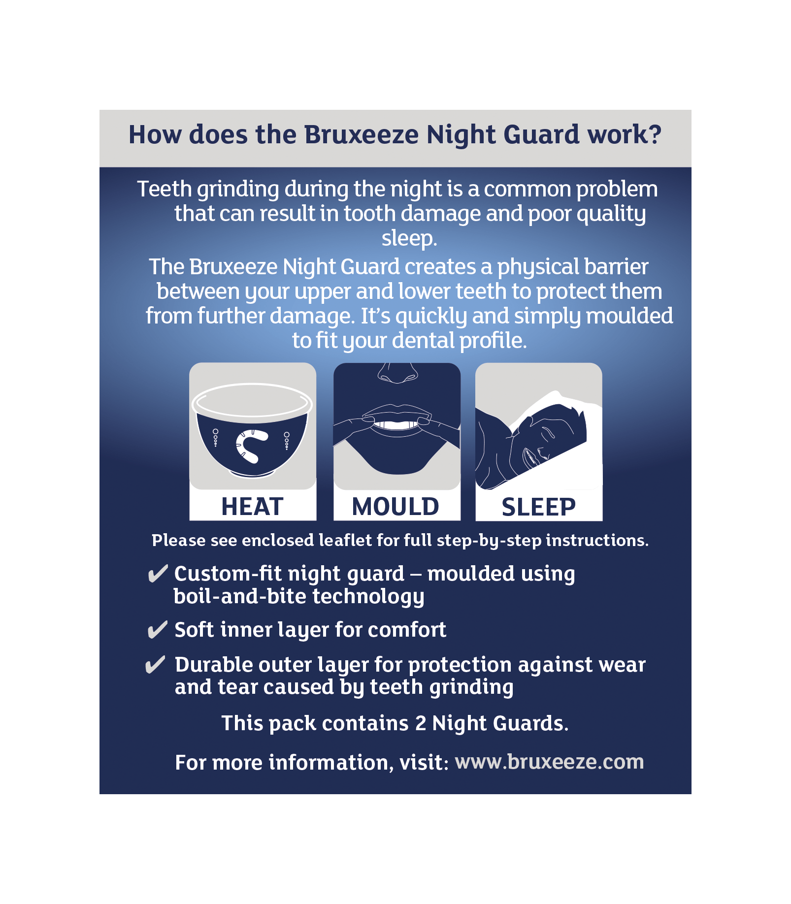 Each pack contains 2 Night Guards to help you stop grinding for up to 12 months.